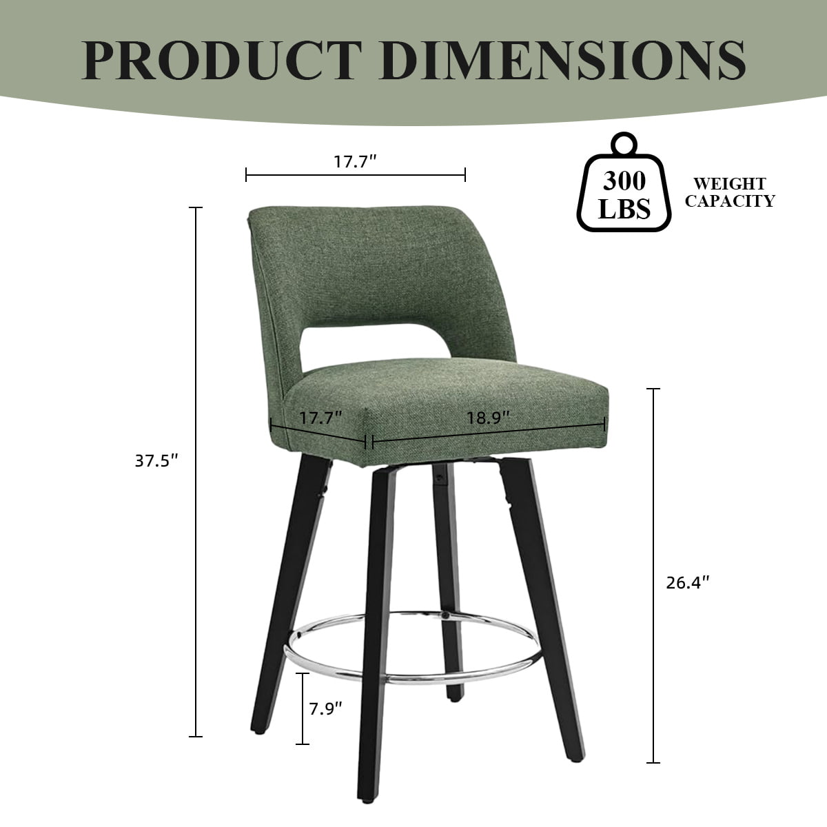 Moderná zelená otočná barová stolička s opierkou chrbta a kovovými nohami | Čalúnené ľanové barové stoličky pre Kitchen Island & Home Pub