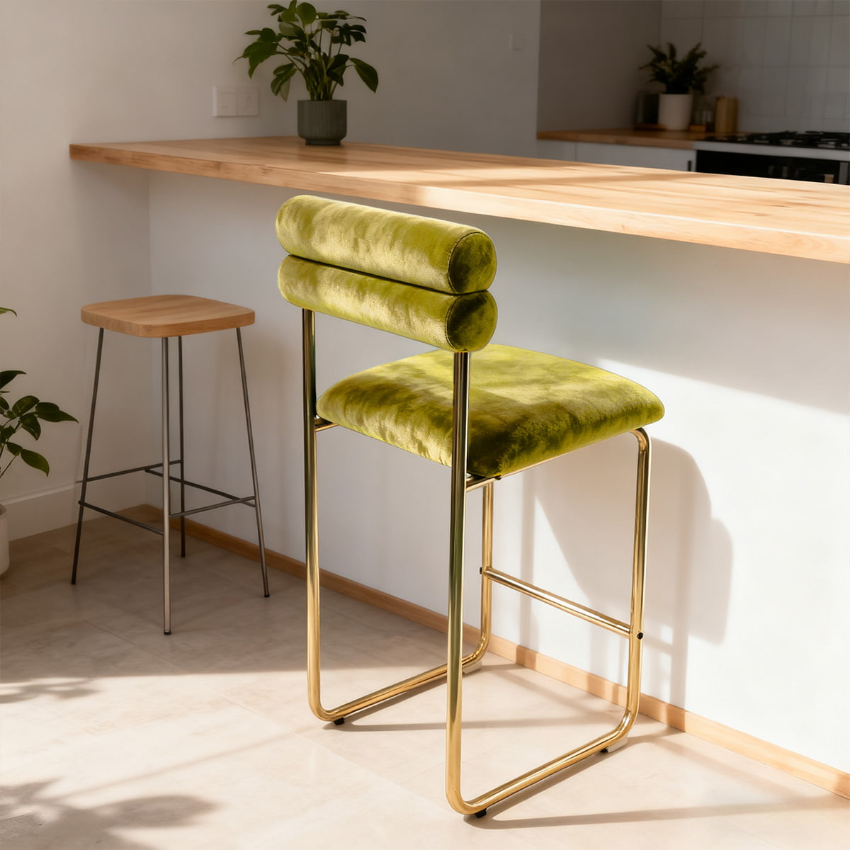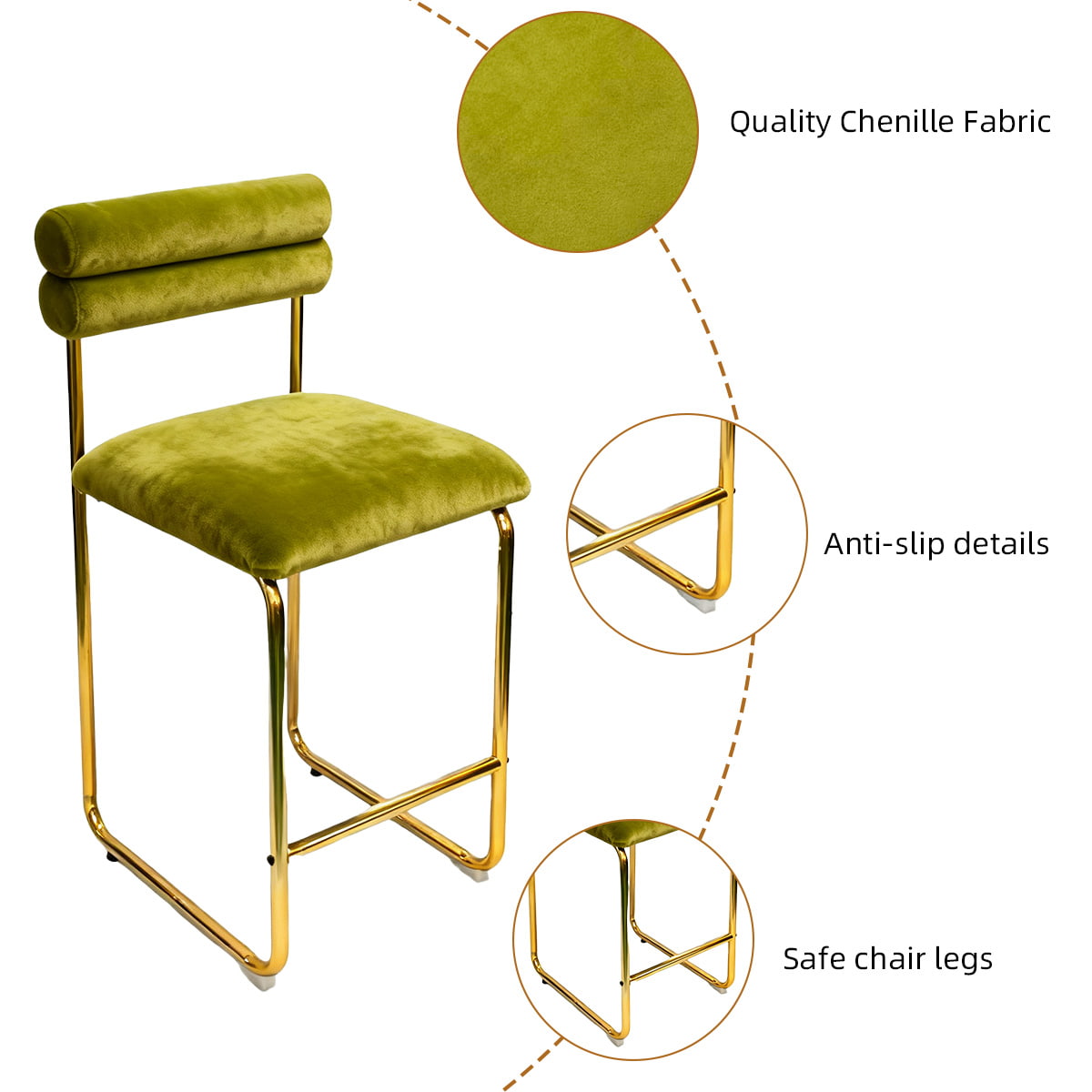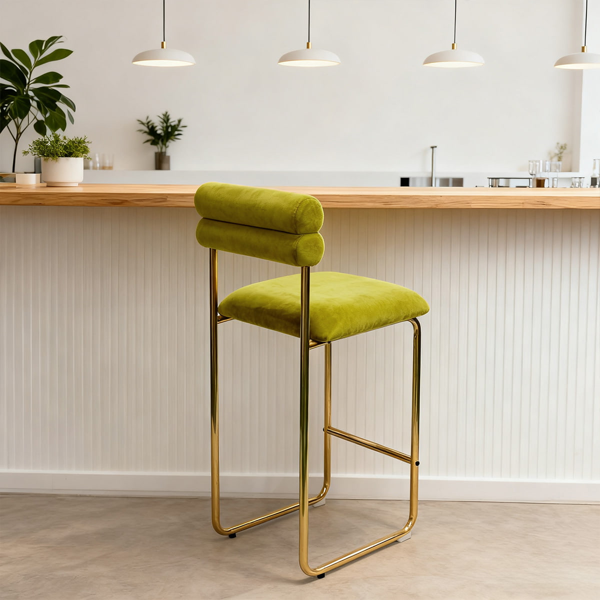 Moderná zelená zamatová pultová barová stolička so zlatým kovovým rámom a opierkou na nohy — minimalistická čalúnená stolička pre kuchynský ostrovček, jedáleň, kaviareň alebo recepciu