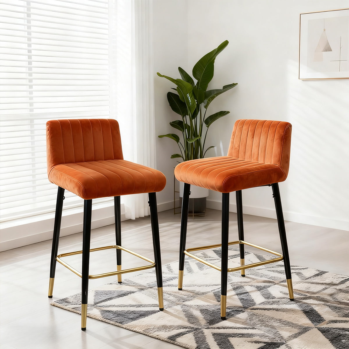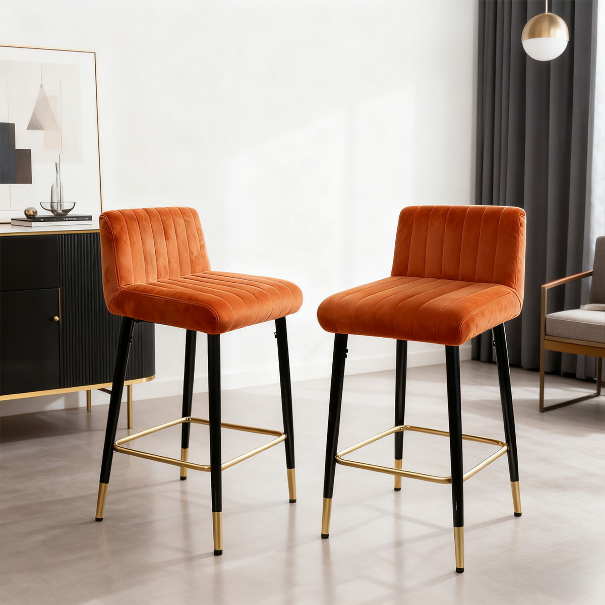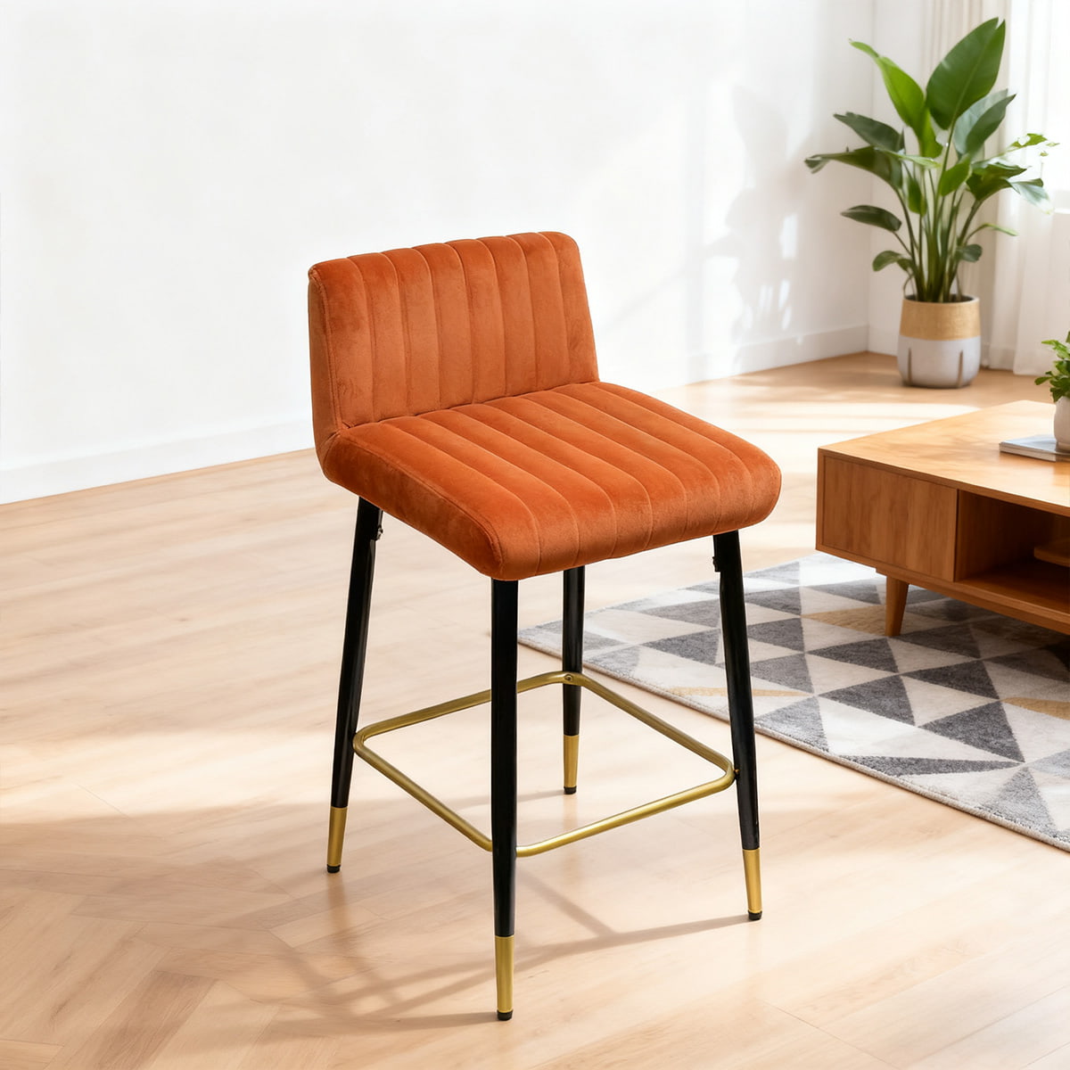 Moderná okrovo oranžová zamatová barová stolička – otočná 360° stolička s čierno-zlatými kovovými nohami, mäkkým čalúneným sedadlom a opierkou na nohy pre kuchynský ostrovček, bar alebo jedáleň