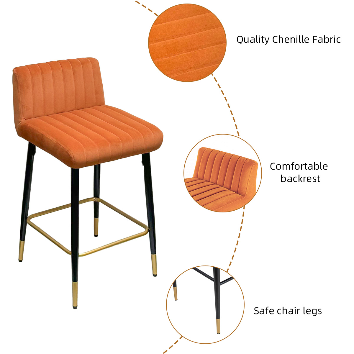 Stolička, ktorá je dokonale dimenzovaná na kuchynské ostrovčeky, bary, kaviarne a jedálenské pulty, spája ergonomický komfort s nadčasovou modernou estetikou. Jeho hrubé polstrované sedadlo a mäkké operadlo poskytujú vynikajúcu podporu, zatiaľ čo vstavaná opierka nôh zlepšuje držanie tela a relaxáciu. Či už hostíte hostí alebo si vychutnávate pokojnú rannú kávu, táto stolička pozdvihne každý okamih eleganciou a pohodlím.