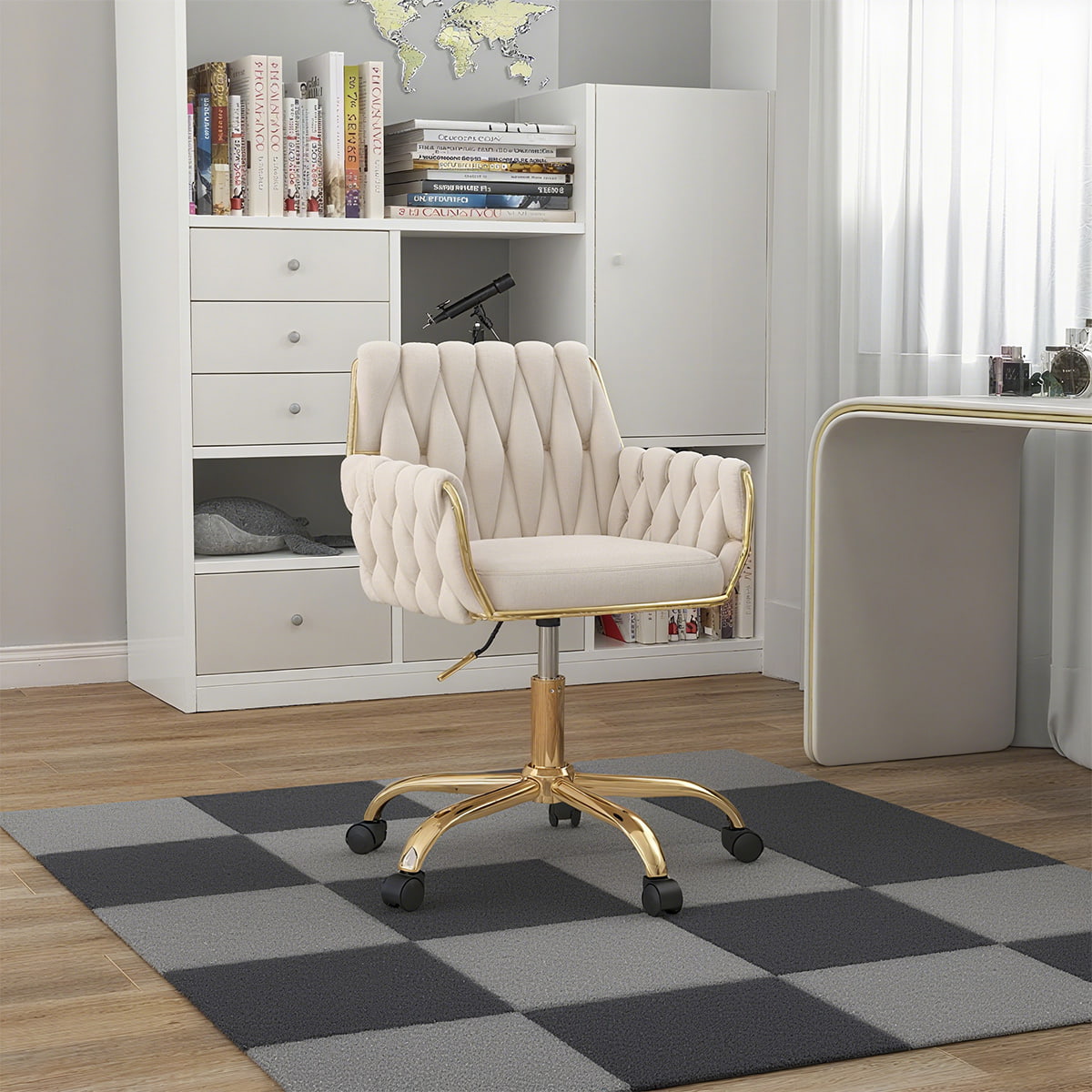 Béžová zamatová stolička do domácej kancelárie – moderná nastaviteľná toaletná stolička so zlatou základňou, ručne tkané operadlo a lakťová opierka, otočná stolička k písaciemu stolu otočná o 360°