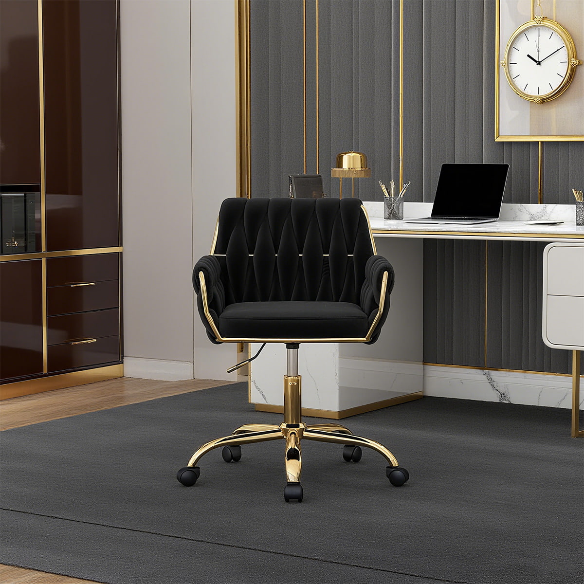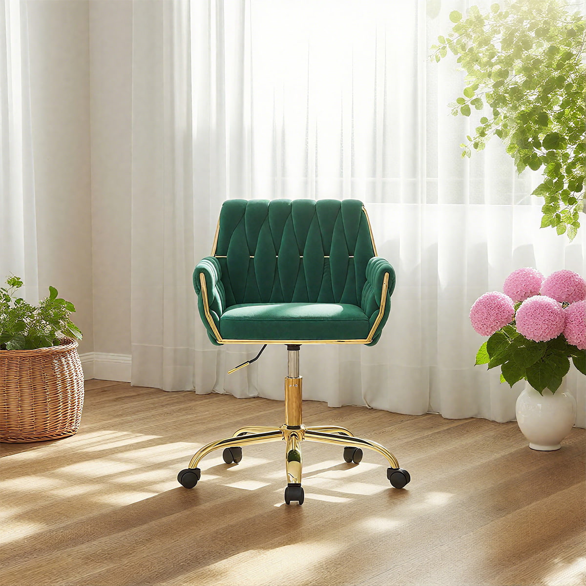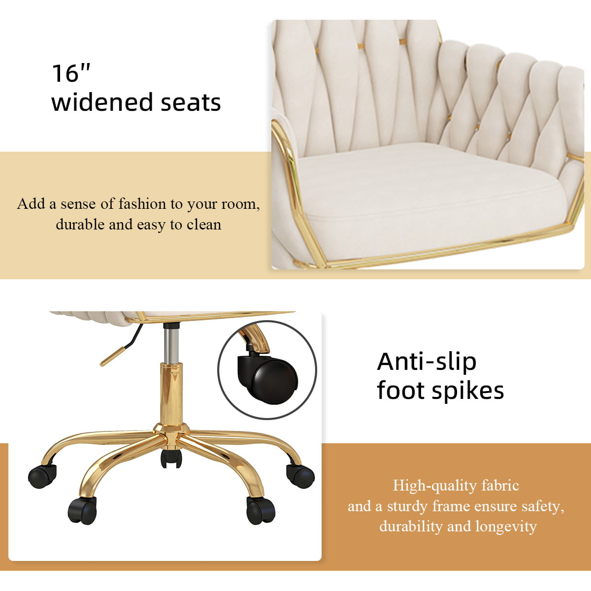 Táto moderná béžová zamatová kancelárska stolička so zlatou základňou je ideálnou toaletnou stoličkou, kreslom do domácej kancelárie a otočnou stoličkou do študovne. S luxusným zamatovým čalúnením, ergonomickým tkaným operadlom, čalúnenými podrúčkami a nastaviteľnou výškou sedadla zaisťuje celodenné pohodlie a zároveň vylepšuje váš interiér. Vďaka 360° otočnej základni s hladkými kolieskami je všestranný na prácu, líčenie, čítanie alebo hranie.