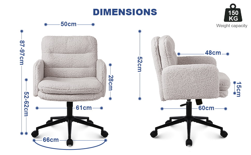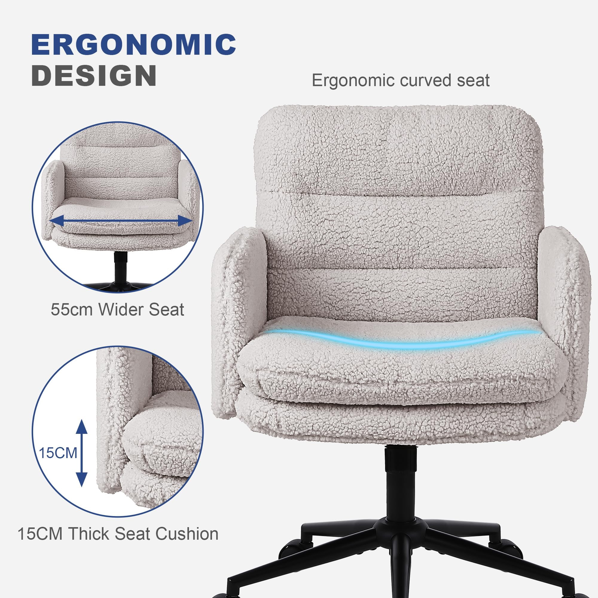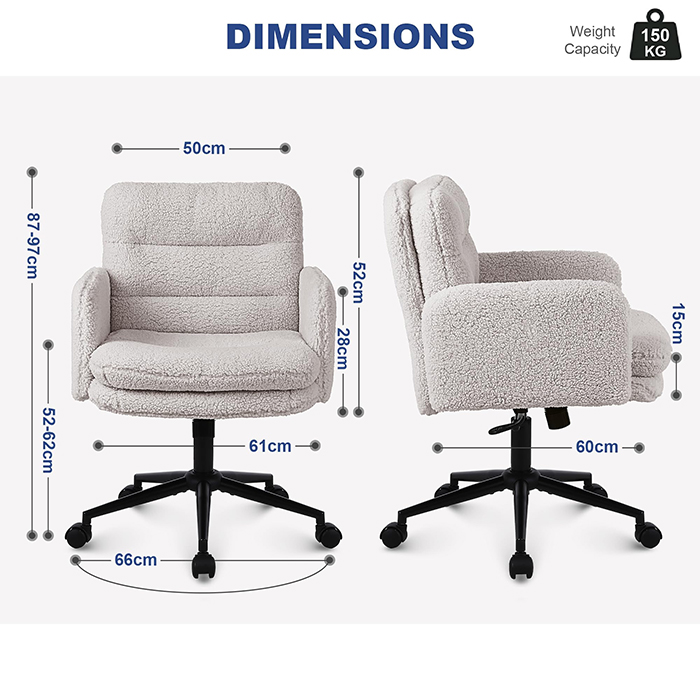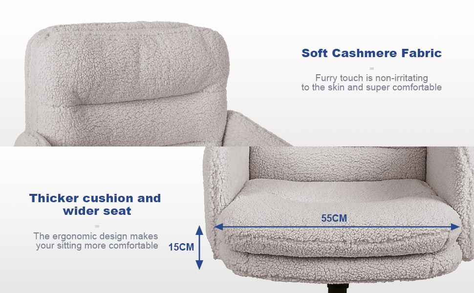 Táto kancelárska stolička z umelého kašmíru je určená pre kupujúcich, ktorí hľadajú rovnováhu medzi pohodlím, estetikou a spoľahlivou kvalitou výroby. Stolička je čalúnená mäkkou umelou kašmírovou tkaninou, ktorá je príjemná k pokožke, a má zosilnenú 15 cm podušku s vysokou hustotou, ktorá poskytuje dlhotrvajúcu oporu bez toho, aby sa zrútila, vďaka čomu je ideálna na predĺženú prácu, štúdium alebo na toaletné potreby. Ergonomická konštrukcia sedadla v kombinácii s plynulým otočným pohybom o 360 stupňov, výškovým nastavením a funkciou jemného hojdania zvyšuje pohodlie pri každodennom sedení pri zachovaní čistého a moderného vzhľadu vhodného pre domáce kancelárie, spálne a interiéry orientované na životný štýl.