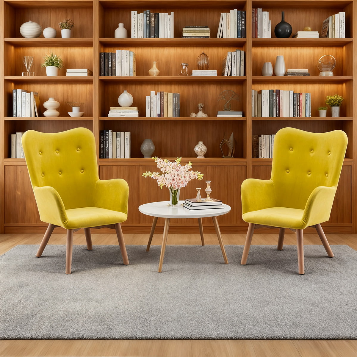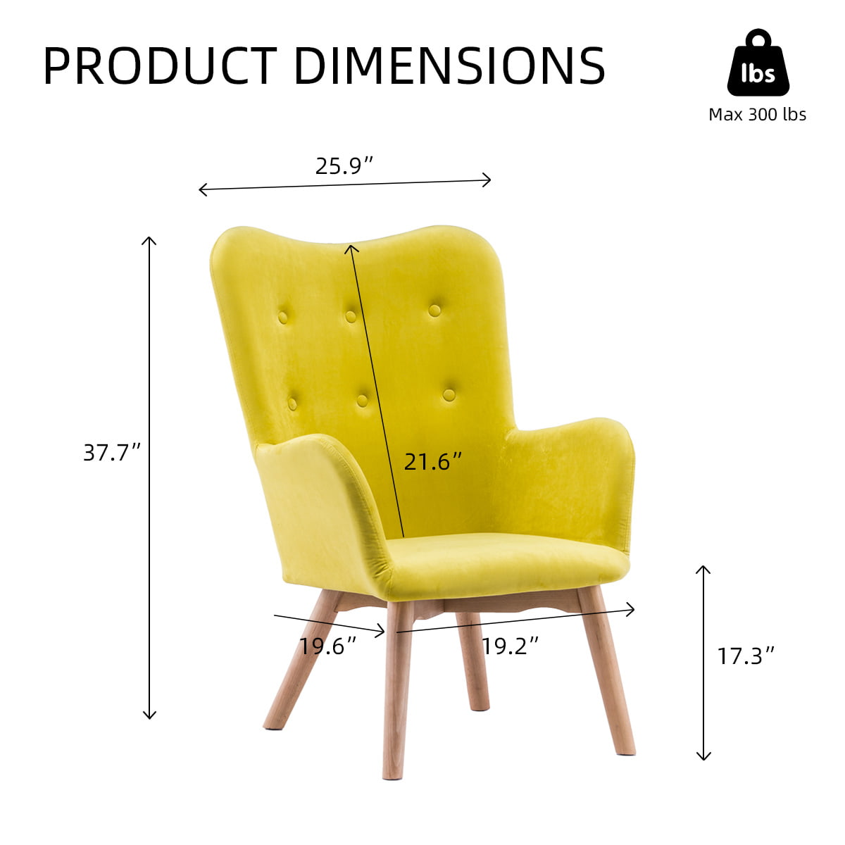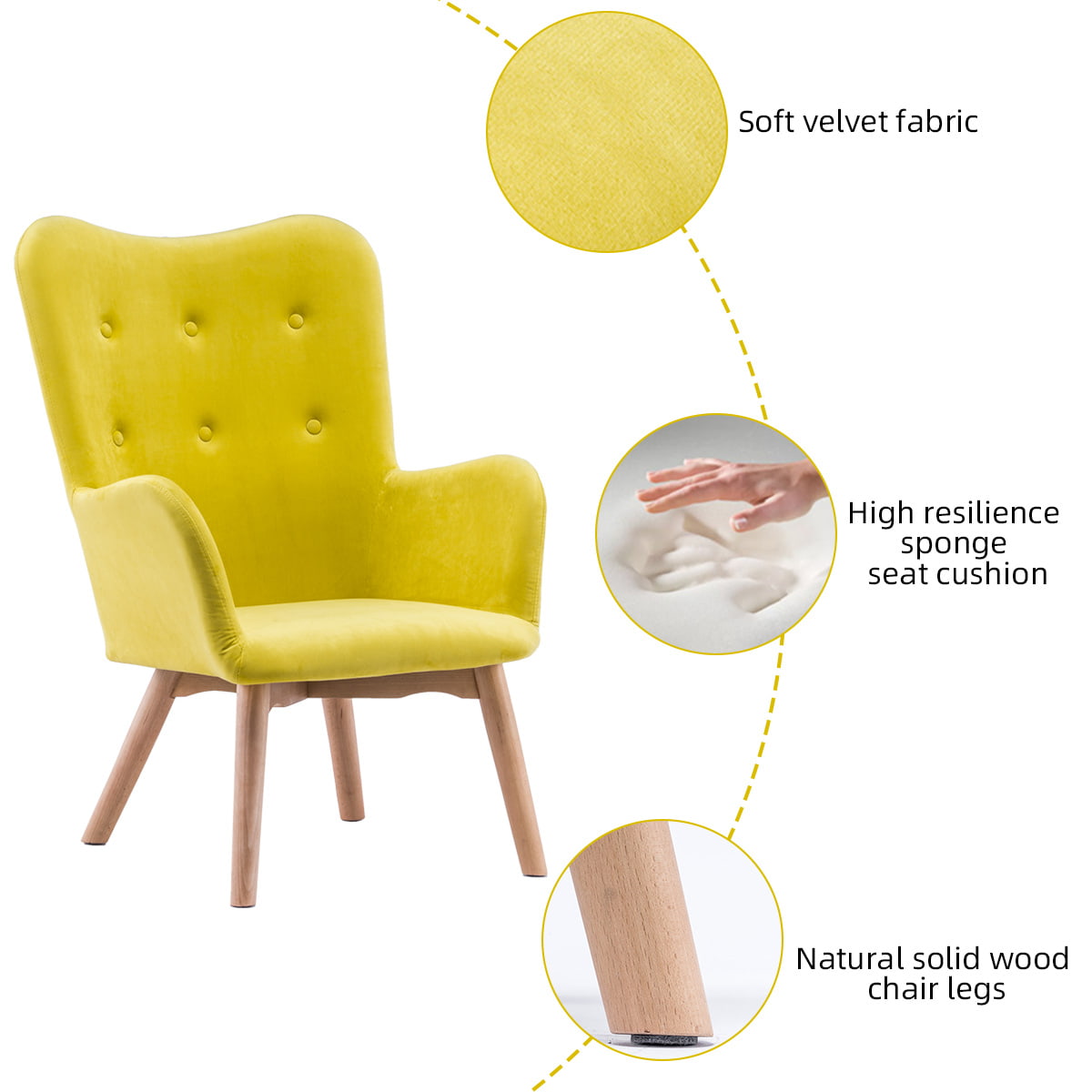 Moderné žlté kreslo s akcentom zo zamatu — všívané kreslo Wingback s drevenými nohami a opierkami na ruky do obývačky, spálne alebo kancelárie