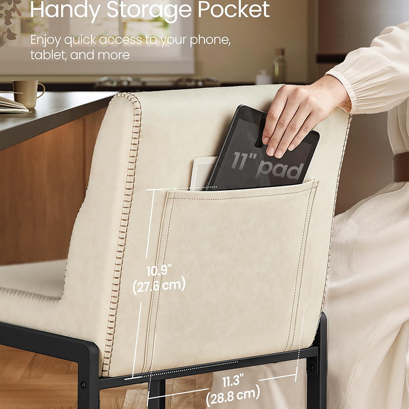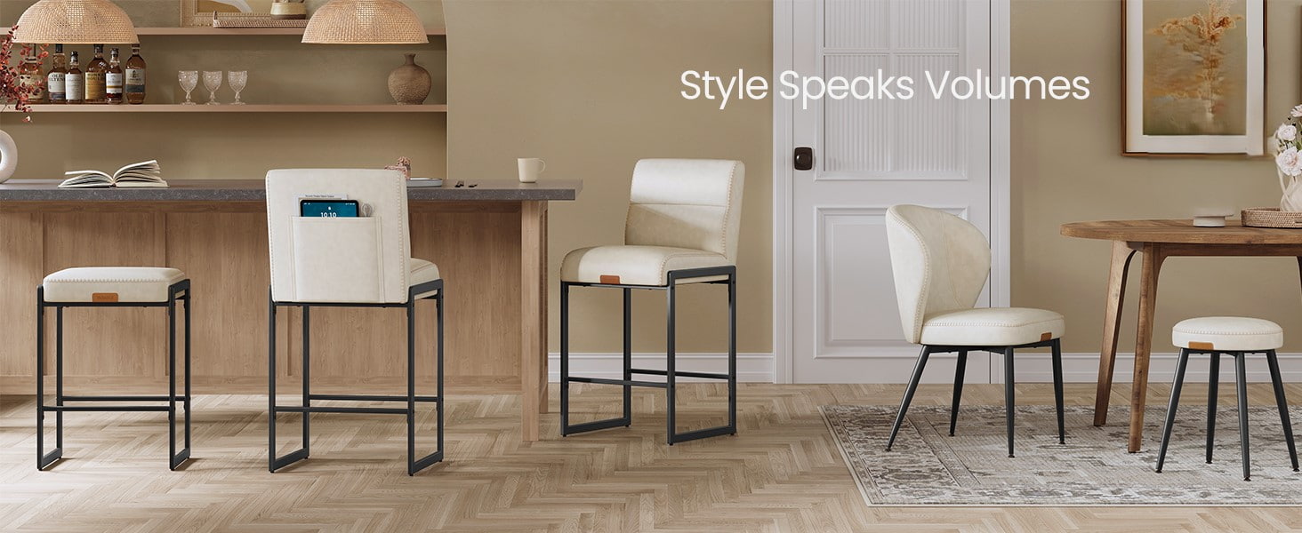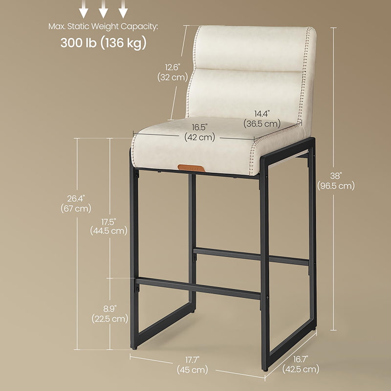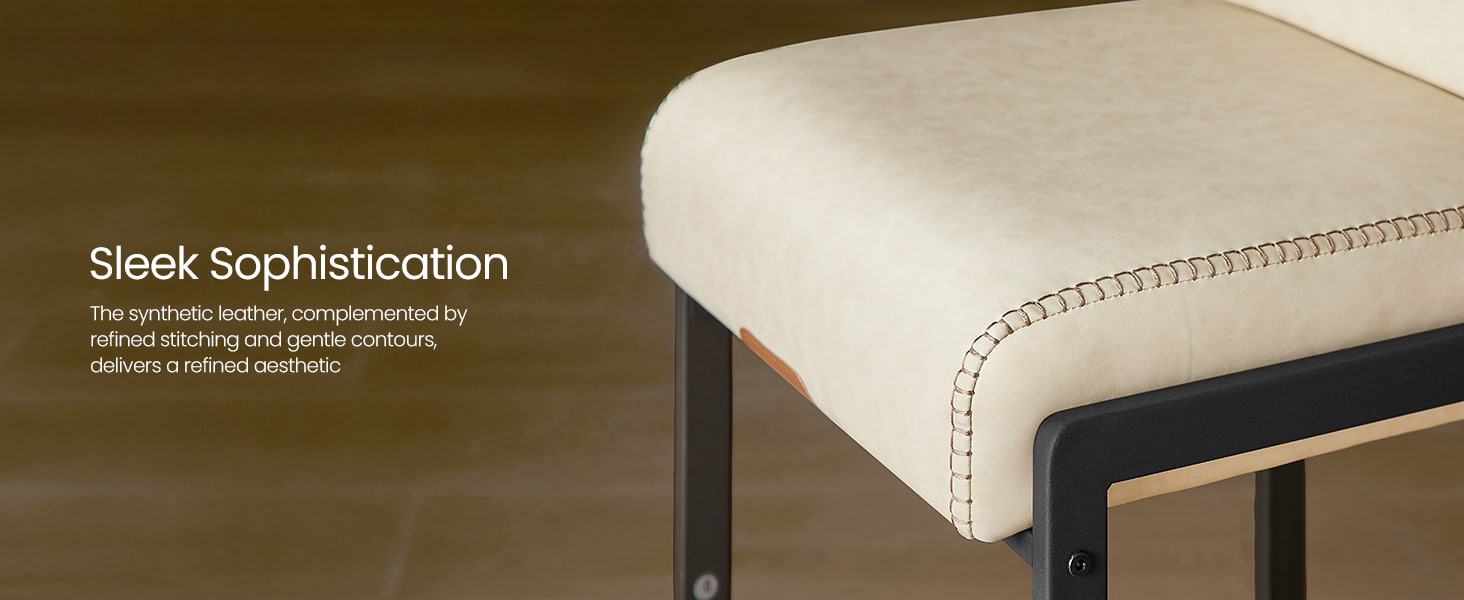 Tieto moderné barové stoličky z polovice storočia určené pre kuchynské linky a jedálenské ostrovčeky, tieto krémovo biele stoličky s vysokým pultom sú vybavené odolným čalúnením zo syntetickej kože s rafinovaným prešívaním a čistým architektonickým kovovým rámom. Ergonomické 103-stupňové segmentované operadlo, 3,9-palcové hrubé čalúnené sedadlo a zakrivená predná hrana poskytujú trvalé pohodlie pri dlhšom sedení, vďaka čomu sú vhodné do obytných kuchýň aj do ľahkých komerčných prostredí, ako sú kaviarne alebo showroomy.